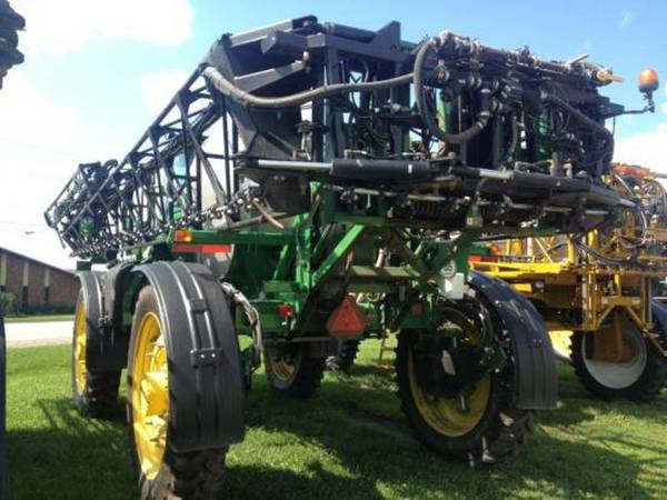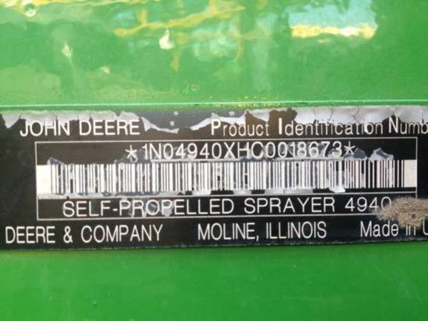 Stock # 119304, 2012 JD 4940, 120′ Hi Flow 15″ 5 Way, Hi Flow Pump, Load Command, Hi Flow #20, UL #6 Nozzles, Dlx Cab, Rotary Beacon, Firestone IF 380/105R50 Row Crop Tires, Row Crop Fenders, Boom Trac Pro 5 Sensor, Wheel Slip Control, Less Belly Shields, HID Xenon Lights, Fence Row RH and LH, Strainers, Lincoln Luber SystemTransmission: Hydrostatic; Drive: 4 Wheel; Front Tire Size: 380/105R50, Condition: 50%L, 20%R; Rear Tire Size: 380/105R50, Condition: 60%L, 60%R; Enclosure: Cab w/Air Cond.; Wheel Tread: Hydr. Adj.; Spacing: 15, in.; Boom Type: Front Fold; Boom Length: 120, ft.; Hyd. Boom Leveling; Boom Section Spray; Tank Capacity: 1200, gallons; Monitor; Foam Markers; Agitator; Rinse Water Tank; Pump Condition: Excellent; Tank Condition: Excellent; Boom Condition: Excellent; Crop Clearance: 50, in.; Condition: Excellent; Tank Type: Stainless Steel