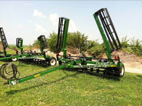 Stock # 17594, Unverferth 2501 rolling reel leveler, 25′ working width, Hydraulic wing fold, 12′ Base, 6.5ft Wings, 9.5Lx15 8ply tires, Dual wheel kit, Lights, Dual hoses, Pull type, Green